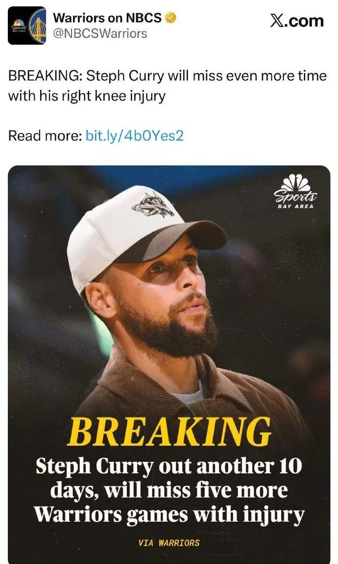 前几天,勇士官宣, 库里因右膝伤势将再休战10天,这将至少再缺席5场比赛。